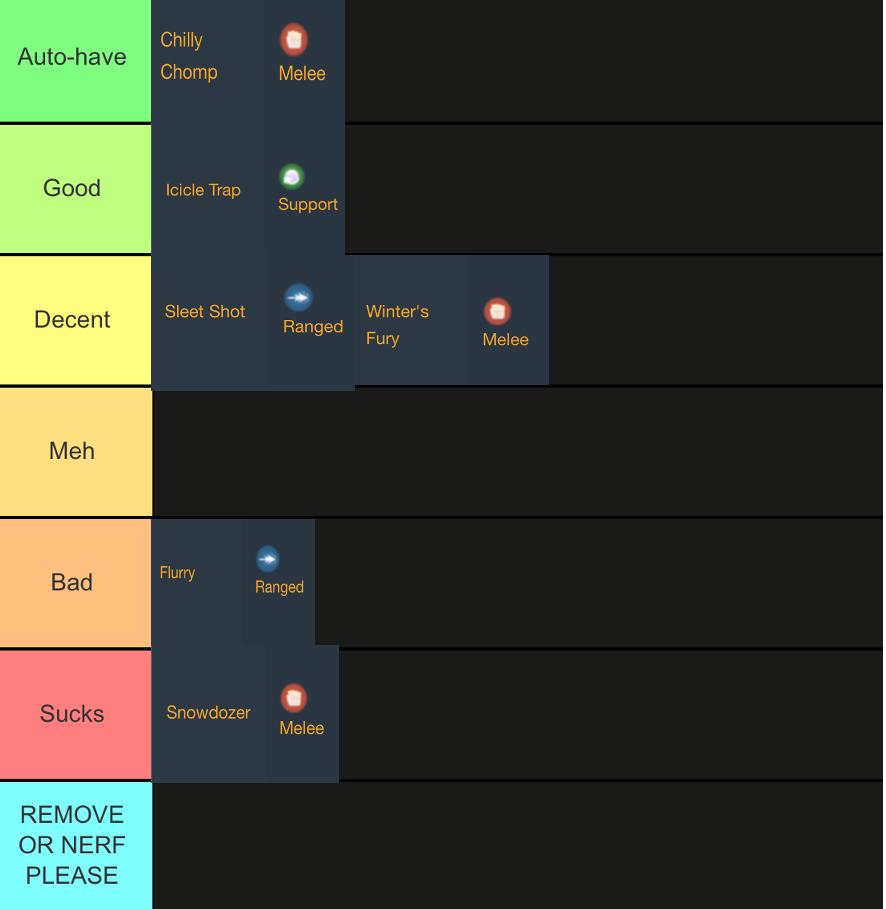 The ice type tier list below is created by community voting and is the cumulative average rankings from 32 submitted tier lists.