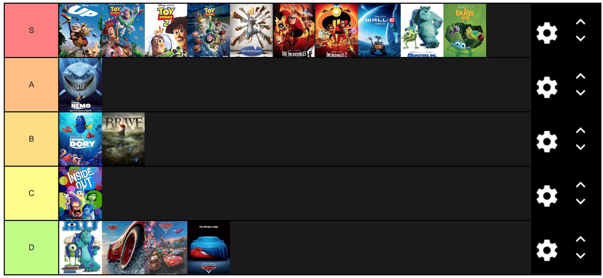 Click savedownload and add a title and description. But it does not have to be used just for gaming. Use our pixar characters tier list template to create your own tier list. It is the superior way to list rank anything and has no limitations. All total drama characters tier list. Doesnt mean its perfect or has to be flawless if it does well with its story the animation and characters to make the movie engaging than its a definitely note worthy pixar animated movie.